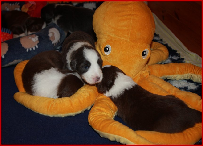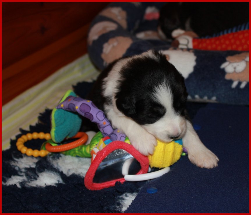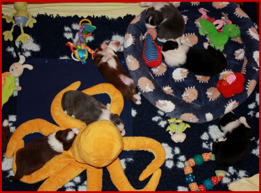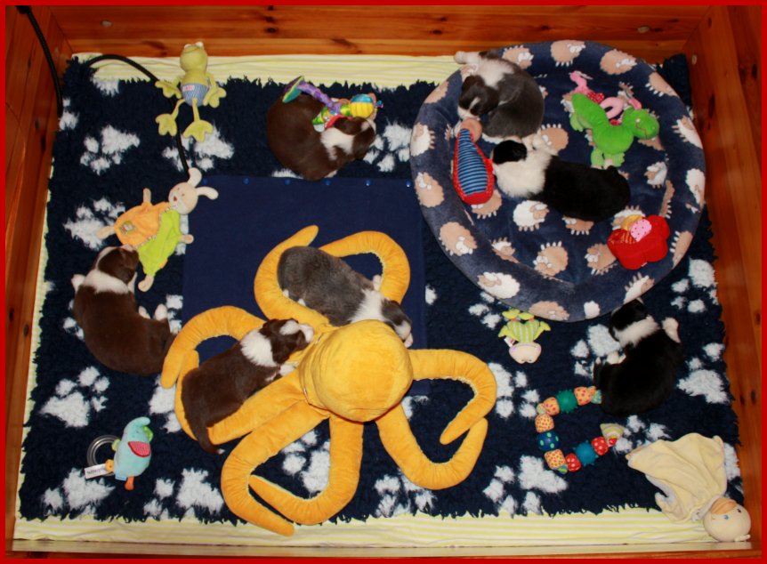 | Da unsere Glücksbärchen schon 2 1/2 Wochen alt sind, die Augen & Ohren schon seit 5 Tagen alle auf haben, sie schon anfangen zu laufen, die Wurfkiste zu erkunden und an ihren Geschwistern zu "knabbern"; meinte Frauchen, das es jetzt an der Zeit ist, das die Glücksbärchen mal ein bisschen Spielzeug zum erkunden bekommen! |