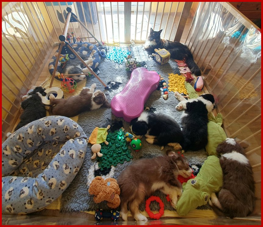 | Schaut mal, wen unser Frauchen bei unseren sieben Glücksbärchen im Laufstall erwischt hat!?! |