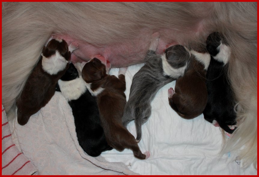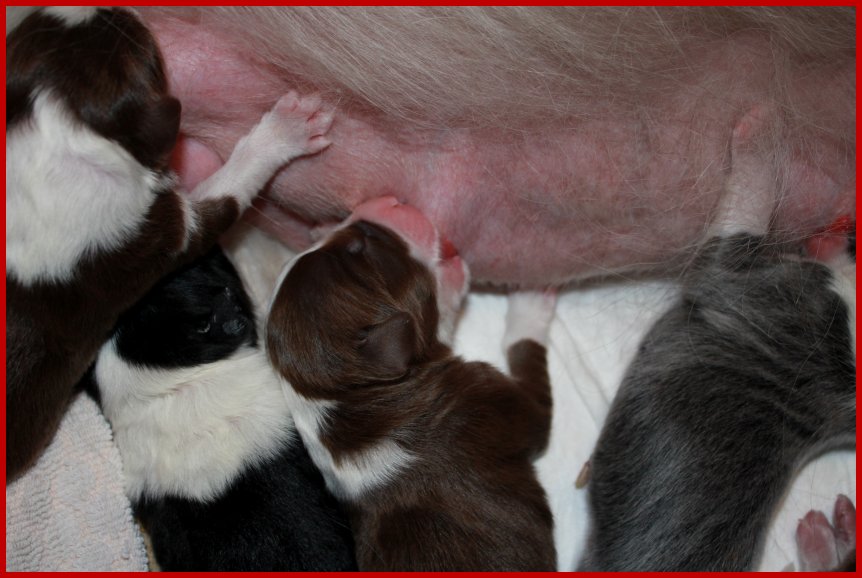 | Unser braun/tricolour Rüde im vollen Einsatz an der Milchbar! |