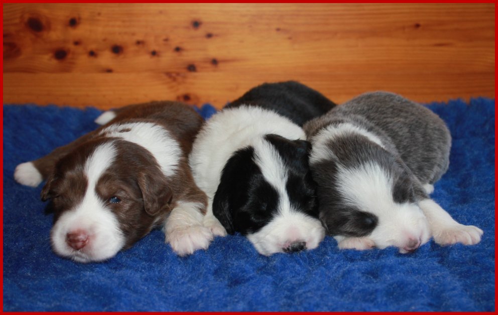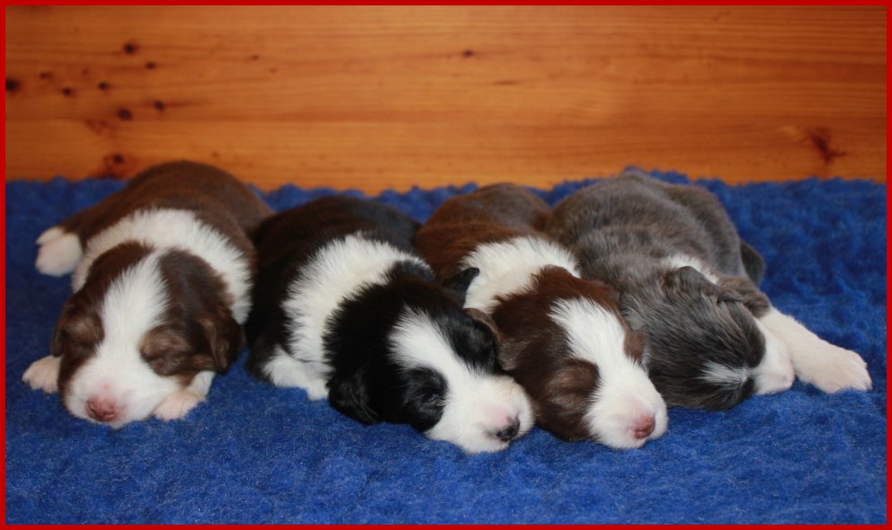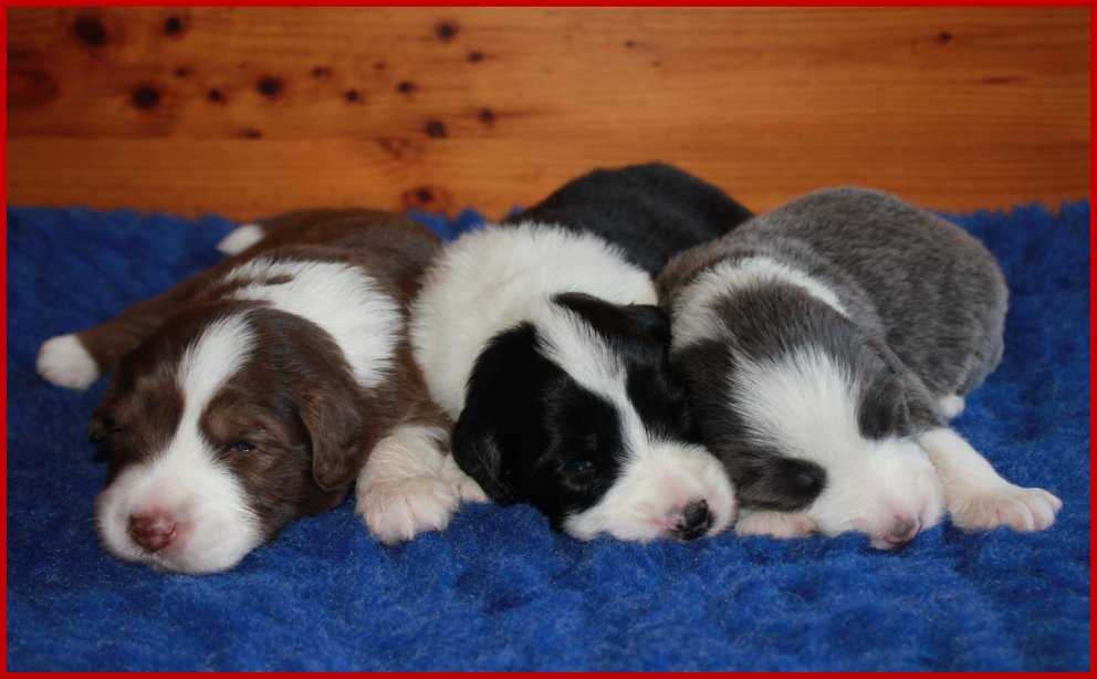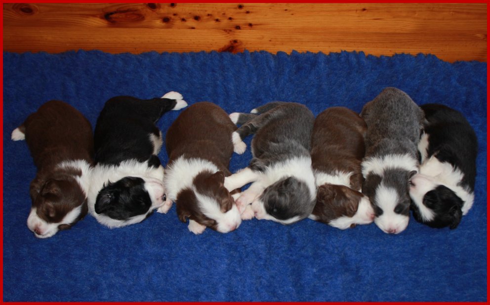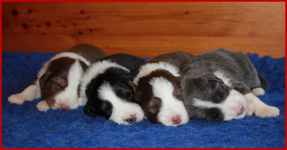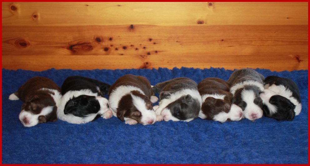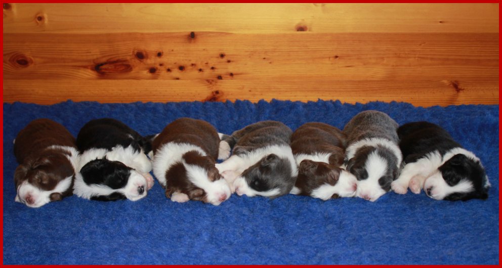| Bevor es zu den Fotos geht, wollte ich Euch nur schnell berichten, dass unsere Glücksbärchen mittlerweile fast alle ihr Geburtsgewicht schon verdreifacht haben, alle schon mit 12 Tagen Augen & Ohren auf hatten und sie schon fleißig laufen und bellen üben!!! |