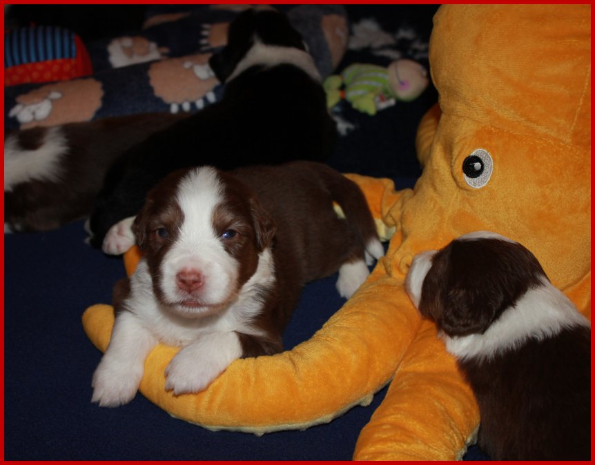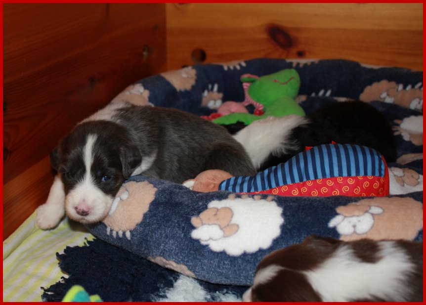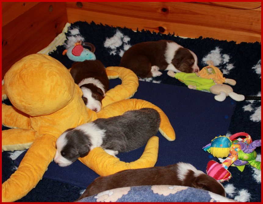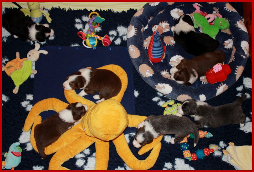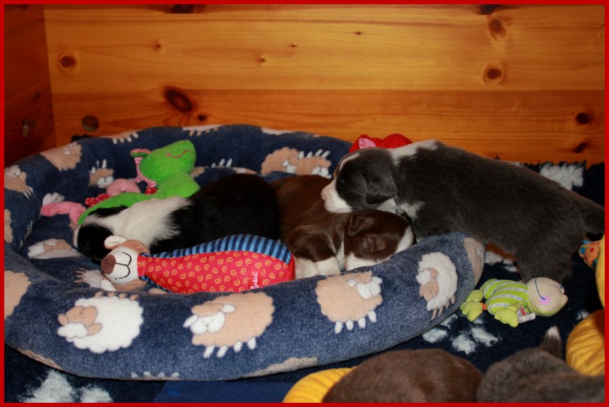 | Da unsere Glücksbärchen schon 2 1/2 Wochen alt sind, die Augen & Ohren schon seit 5 Tagen alle auf haben, sie schon anfangen zu laufen, die Wurfkiste zu erkunden und an ihren Geschwistern zu "knabbern"; meinte Frauchen, das es jetzt an der Zeit ist, das die Glücksbärchen mal ein bisschen Spielzeug zum erkunden bekommen! |