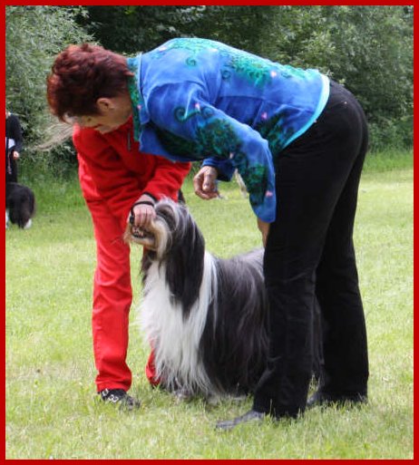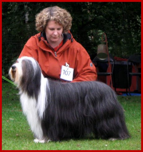| 9 Jahre alte Hündin, vorzügliche Gesamterscheinung, vorzüglicher Kopf, vollzahniges Scherengebiss, vorzügliche obere Linie, vorzüglich entwickelter Brustkorb, korrekte Winkelungen, flottes raumgreifendes Gangwerk, üppiges Haarkleid, liebes aufmerksames Wesen. | ||