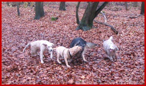 | Aber dann wurden sie abrupt von "Leonart" (links & Goldie), "Ronja" (2te v. rechts & Mix) & "Henry" (rechts & Labbi) gestört und weiter ging das Spiel zu fünft!!! |