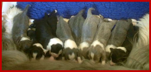| Es sind 2 fawn/weiße, 1 blau/weißer & 1 schwarz/weißer Rüde, sowie 3 blau/weiße & 3 schwarz/weiße Mädchen die bei uns am 25. März 2004 auf die Welt kamen! |