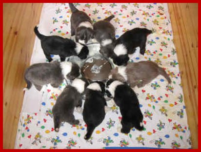 | Alle neun haben sich von ganz allein ordentlich um den Futterring verteilt und süppeln ganz brav ihre Welpenmilch!
