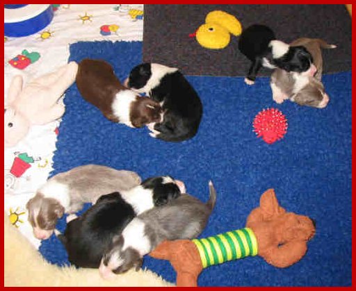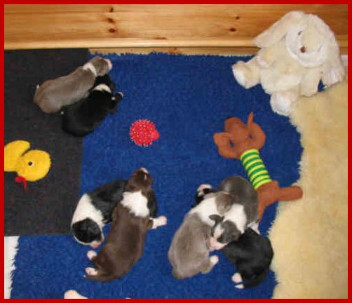| Hi Leute, schaut mal, unsere sieben Beardiebabys haben heute ein Lammfell, eine kratzige Fussmatte und ein bisschen Spielzeug bekommen!!! |
