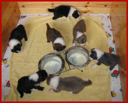 | Hallo Leute! So nun ist es so weit, unsere sieben Zwerge dürfen heute zum ersten Mal ganz alleine ihre Welpenmilch schlabbern! |
