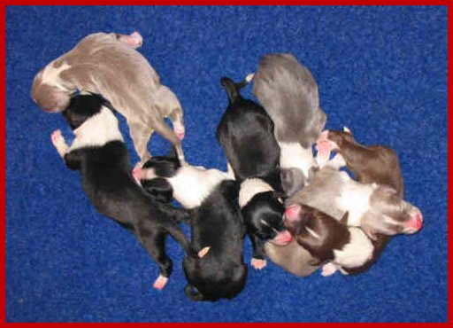 | So, nun ist es schon Sonntag Morgen um 1.00 Uhr, die Wurfkiste sauber & Mama "Joy" frisch gemacht und jetzt wird es Zeit, für die ersten Gruppenbilder, der sieben Zwerge!!! |