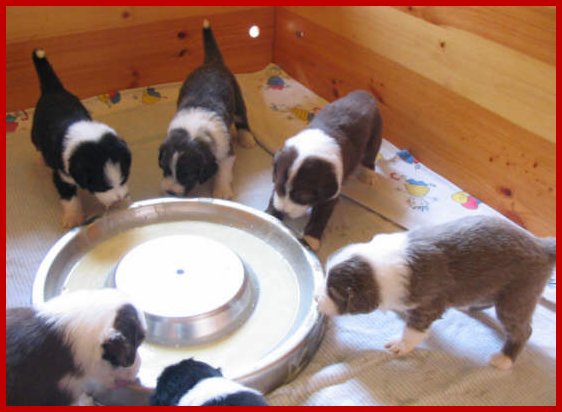| Sonst gibt es immer eine Milchschlacht, alle sehen aus wie durch die Milch gezogen und die Wurfkiste muss von ganz viel klebriger Welpenmilch befreit werden! |