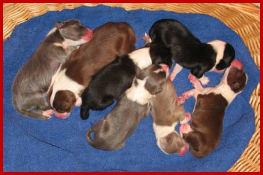| Nachdem dann alle Babys da waren, hiess es erst einmal, alles aufräumen, Mutter und Kinder versorgen, die Wurfkiste wieder neu herzurichten und die Kleinen immer wieder anlegen, damit sie bald ganz gross & stark sind! |