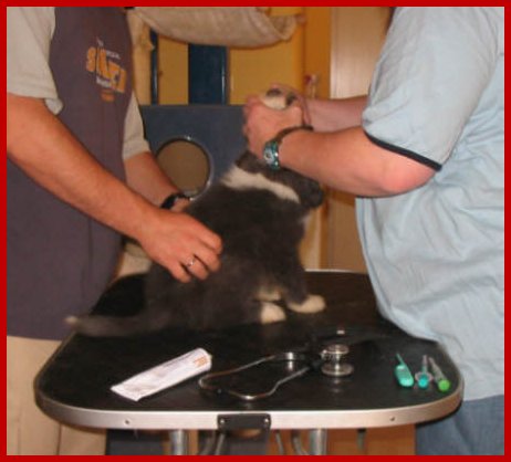 | Um 8.30 Uhr kam Karola Grashof, unsere super tolle Tierärztin, und hat alle Babys genau untersucht, geimpft & gechipt! |