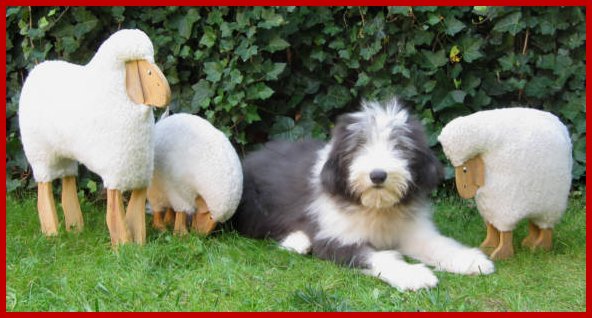 | "Monty" scheint sich zu fragen, was er als 11,77 kg schweres Beardieschaf, zwischen Frauchens Schäfchen zu suchen hat, aber macht trotzdem ganz brav mit!!! | ||