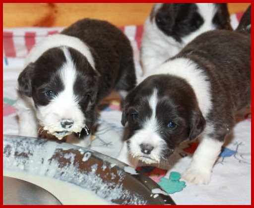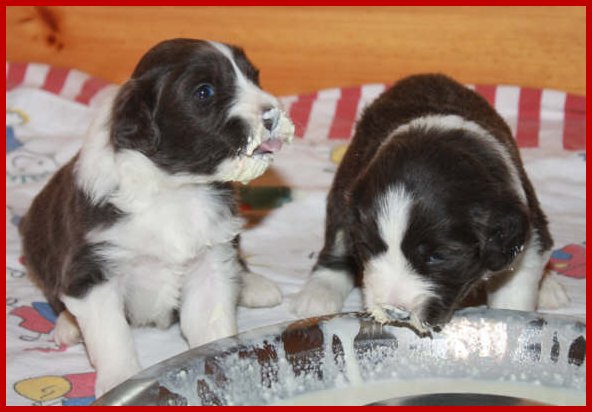 | Seit ein paar Tagen bekommen sie ja schon ein bisschen Welpenmilch von unseren Zweibeinern aus dem Schälchen gefüttert, aber heute durften sie zum ersten Mal ganz alleine die leckere Welpenmilch vernaschen!!! |