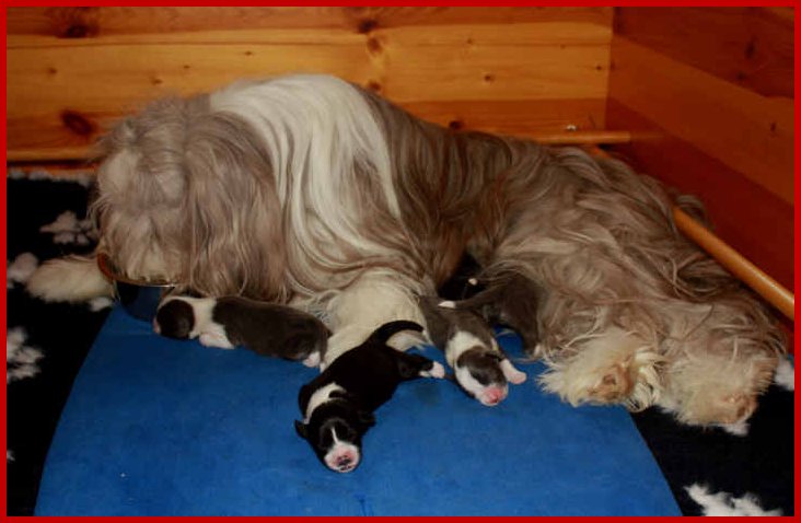 | Neben dem Futternapf liegt der 1te blau/weiße Rüde, in der Mitte vorne hat es |