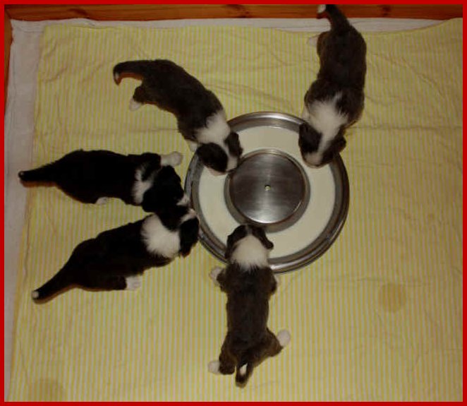 | Tja, es war also nichts mit "Milchschlacht", wir haben wieder einmal tolle Welpen, die schon richtig super "Tischmanieren" haben!!! |