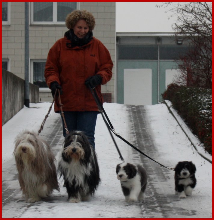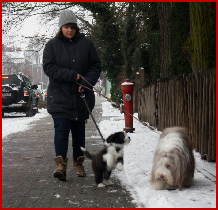 | Trotz alledem ist es gut, das sie es hier mit ihren vertrauten Bezugspersonen Caroline & Mara und Mama "Kate" & mir als Beardie Unterstützung zum ersten Mal erfahren haben, denn positive Erfahrungen in den ersten 8 bis 12 (zum Teil bis zu 16) Lebens-wochen, werden als positive im Gehirn weg gespeichert und das bleibt ein Hundelebenlang unauslöschbar !!! |