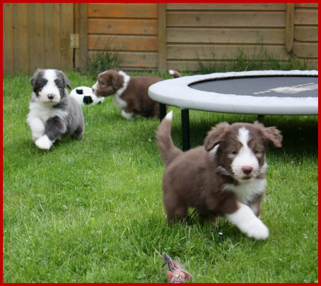 | Da die zauberhaften Sieben so viel Spaß an ihrem Ausflug ins Hundegehege hatten und ja auch langsam "große" Beardies werden, werden ihre Ausflüge ins Hundegehege ab jetzt täglich stattfinden und langsam auf drei bis viermal für 30 bis 40 Minuten gesteigert; so das sie mehrmals täglich durch das Hundegehege flitzen können und dort viele neue "Turngeräte", Untergründe, Spielzeug und "gefährliche" Sachen wie Flatterbänder, Planen, Becherschreck und dergleichen kennen lernen!!! |