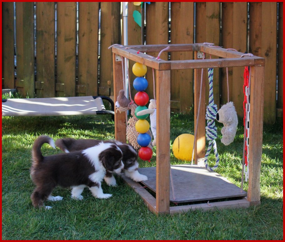| Da die Fünf so viel Spaß an ihrem Ausflug ins Hundegehege hatten und ja auch langsam "große" Beardies werden, werden ihre Ausflüge ins Hundegehege ab jetzt täglich stattfinden und ganz langsam auf drei bis viermal für 30 Minuten gesteigert; so das sie mehrmals täglich durch das Hundegehege flitzen können und dort viele neue "Turngeräte", Untergründe, Spielzeug und "gefährliche" Sachen wie Flatterbänder, Planen, Schauckelbrett, Becherschreck, Wackelbrücken und dergleichen kennen lernen!!! |